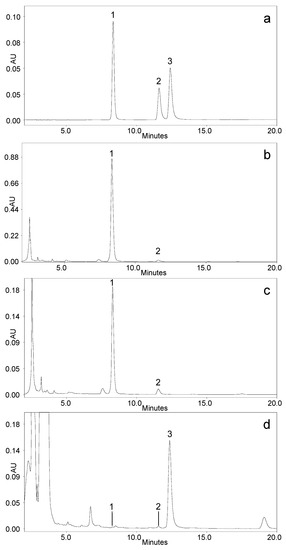 Chromatographic separation of cyanogenic glucosides: (a) mixture containing pure standards of amygdalin (1), prunasin (2) and sambunigrin (3), (b) plum kernel, (c) apple seed, (d) Sambucus nigra leaf.