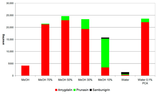 Figure 2 shows the extraction from apple seed with different solvents. As can be seen, the extraction of amygdalin in methanol mixtures was greater in a 50% mixture and at a higher proportion of water the recovery of amygdalin decreases and the content of prunasin and sambunigrin increases. It is important to highlight that sambunigrin has not been described in apple seed, but nonetheless, our results show that this compound can be formed and that the highest concentration of sambunigrin is detected when the solvent is water. In this sense, several authors have indicated that the degradation of amygdalin is closely linked to the extraction conditions [24,25].