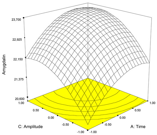 The physicochemical properties of amygdalin and sambunigrin are similar, since they are both saccharides (gentiobiose or glucose) linked to the same aglycone (mandelonitrile). Furthermore, they are soluble in water, so it seems reasonable that the models built for each of the analytes should be similar (Figure 3 and Figure 4). Thus, for both analytes, similar models were obtained in which the significant first-order factors were time and amplitude but not the frequency with which the pulses are emitted (Table 2), while the differences are found in the second order terms (quadratic terms and interactions).