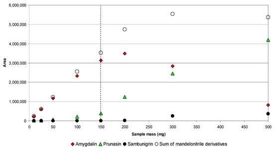 For this, the sample mass was varied between 0.01 and 0.5 g, keeping a fixed volume of 10 mL as it was a recommended working volume for the sonotrode used (diameter 2 mm). The behavior was different in the evaluated matrices. Thus, while in S. nigra leaves the response for sambunigrin was proportional to the mass in the entire range evaluated (R = 0.9995, Supplementary Figure S1), in the case of apple seed, the efficiency of the extraction of amygdalin was linear only in the range 0.01–0.15 g (R = 0.994, Figure 5). In addition, the lower extraction of amygdalin was accompanied by an increase in the percentage of prunasin and sambunigrin in the extracts, which indicates the degradation of amygdalin by hydrolysis of the β (1–6) bond of gentiobiose and the formation of the two monoglycosidic epimers. Likewise, as can be seen in Figure 5, the sum of the three mandelonitrile CNGs ceases to be linear from a mass of 0.2 g (ratio 1/50, r = 0.998), which shows that, in addition to hydrolysis of the β (1–6) bond of gentiobiose, subsequent hydrolysis of the glycosidic bonds of prunasin and sambunigrin takes place. Based on these results, it can be established that, in the case of apple seed, ratios greater than 1/66 may lead to underestimation of the content of amygdalin, as a result of its hydrolysis and the formation of the epimers prunasin and sambunigrin, while ratios greater than 1/50 give rise to underestimated values for total mandelonitrile CNGs.