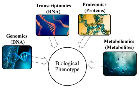 Metabolomics is one of the four “omics” technologies (Figure 1). It is a technical and systematic approach that involves the study of metabolite concentrations and interactions in organic entities. The approach simultaneously aims to detect the overall changes in metabolites in bio-systems involving microorganisms, plants, animals, and humans, which directly reflects the underlying biochemical activities occurring in the cells, tissues, organs, and organisms. Metabolomics is used in various fields, including pharmaceutical, food, agriculture, etc. Food metabolomics involves the application of metabolomics in food resources, production, and processing, as well as in human diets. The application of food metabolomics has gradually increased and made significant breakthroughs in recent years, along with the revolution in the food industry [,,].