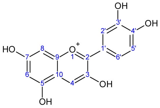 As for compound A7, it had [M]+ m/z 787 yielding MS/MS ions of m/z 625 [M-hexose]+, 449 [M-338]+, and 287 [M-500]+. Although the phytochemical dictionary of natural products database showed the previous identification of cyanidin-3-feruloyl-glucosyl-galactoside (glycosylation and acylation at C3 only), the retention data indicated that the glycosylation occurs at both C3 and C5. This is because an anthocyanin glycosylated and/or acylated at C3 only would have a free C5, and consequently an earlier retention time than that of A7 (Figure 1). Thus, compound A7 was tentatively identified as cyanidin-3-(feruloyl)-5-glucoside [6].