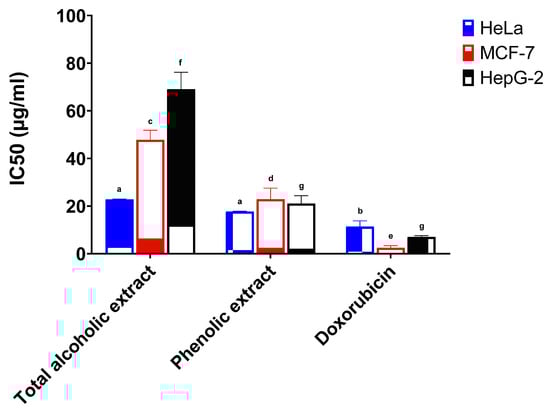 The IC50 of the total alcoholic extract and the phenolic extract against the HeLa and MCF-7 cell lines were found to be statistically significant when compared to doxorubicin. The total alcoholic extract also showed statistical significance against the HepG-2 cell line in comparison with the phenolic extract and/or the standard doxorubicin. In addition, both extracts showed statistical significance to each other against MCF-7, but no significance was present for the HeLa cell line. The statistical significance of cell growth inhibition was determined using six different concentrations (compared to doxorubicin) and is shown in Figures S5–S7.