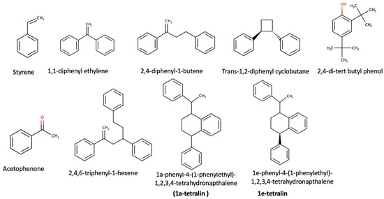 Styrene can be oxidized to form acetophenone, which can be considered one of the basic side reaction products [7], while 2,4-di-tert butyl phenol is a degradation product of an additive, namely, Irgafos 168 [27]. All the remaining compounds are styrene oligomers that are degradation products of the PS polymer [1].