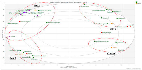 PCA biplot for the analysis of the applied diets in relation to the associated microbiome (purple dots: monomers/oligomers/plastic-oriented compounds; red dots: physical condition and protein/nitrogen of insects; green dots: microbial species).