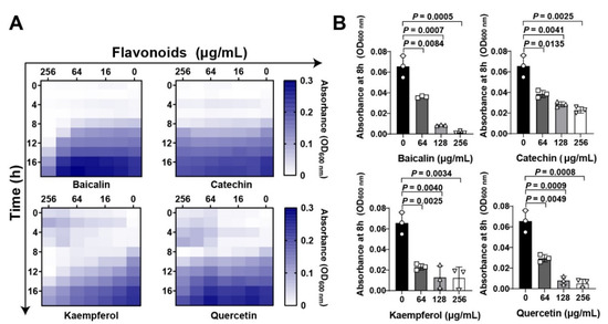 Flavonoids inhibit Staphylococcus aureus growth at the initial period: (A) Flavonoids inhibited S. aureus in both time- and dose dependent manners. Chessboard method was employed to detect the antibacterial effect of flavonoids. Different concentrations of flavonoids including baicalin, catechin, kaempferol, and quercetin (0 to 2048 μg/mL) were treated with S. aureus at different time points (0, 4, 8, 12, 16, and 18 h). Bacterial growth was quantified based on the absorbance by a plate reader at wavelength of 600 nm. (B) Quantification of S. aureus absorbance at 8 h under flavonoid treatment at the final concentrations of 0, 64, 128, and 256 μg/mL. Data were shown as Mean ± SED (n = 6).