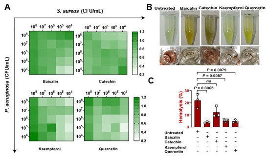The effect of flavonoids on coinfection of S. aureus and P. aeruginosa were evaluated by using the infected cellular model of pulmonary microvascular endothelial cells (PMVECs) according to the previous method [18,19]. Flavonoids including baicalin, catechin, kaempferol, and quercetin (at the concentration of 128 μg/mL) were used to treat with co-infected PMVECs, which 109 cells per well were infected with S. aureus and P. aeruginosa at the final concentration ranges from 104 to 108 colony-forming units (CFUs) in DMEM with 1% FBS. Finally, the numbers of bacterial mixtures were quantified after 10 h and the hemolysis of mixtures were detected as per the previous method above.