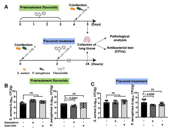 Clinical validation of flavonoids on the mouse lung coinfection of S. aureus and P. aeruginosa: (A) Scheme of the pre-treatment and treatment of flavonoids on mouse lung coinfection. Briefly, mice were coinfected with S. aureus (1 × 109 CFUs) and P. aeruginosa (1 × 109 CFUs) and flavonoids were pre-treated or treated with infected mice for further determine the therapeutic effects. (B,C) Kaempferol had the better antibacterial effects on the lung coinfection of S. aureus and P. aeruginosa compared to quercetin on both pre-treatment (B) and treatment (C).