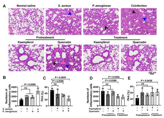To investigate the treatment differences between kaempferol and quercetin on combating bacterial coinfection, the pathological detection of co-infected lung tissues was analyzed by H&E staining. Images showed that the increased inflammatory cells (black arrowheads) accompanied with congestion points (blue arrowheads) in the lung tissue were only found from co-infected mice compared to S. aureus or P. aeruginosa alone infections (Figure 5A(upper),B). In addition, the P. aeruginosa infection and bacterial coinfection decrease the pulmonary alveolar area (PAA), suggesting that damage of lung tissue occurred (Figure 5C). Additionally, pretreatment or treatment of flavonoids with co-infected mice showed that kaempferol and quercetin had the pretreated function for bacterial coinfection, while only kaempferol could treat the co-infected mice (Figure 5A,D,E). These findings indicate that flavonoids decrease the tissue damage, and inflammation might have assisted the therapy of bacterial coinfection.