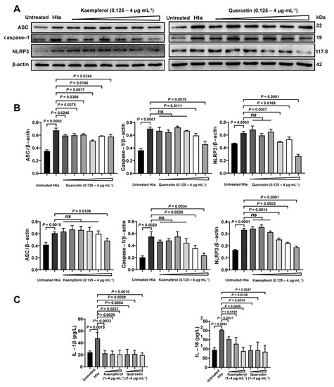 Previously, we had confirmed that flavonoids therapied the bacterial coinfection though suppressing Hla (Figure 3). Thus, we further investigate the impact of flavonoids on inflammatory pathway of the Hla-treated PMVECs. Firstly, we found that Hla indeed enhanced the inflammation of co-infected PMVECs by upregulations of the inflammatory proteins of ASC, caspase-1, and NLRP3 (Figure 6A,B), which might explain why the coinfected mice had larger numbers of inflammatory cells (Figure 5A,B). Next, kaempferol and quercetin significantly reduced the inflammation of the co-infected PMVECs in a dose-dependent manner (Figure 6A,B), suggesting that inhibition of the inflammation was required in the antiinfection strategy of flavonoids. Lastly, we further detected the inflammatory factors of IL-1β and IL-18; results also revealed that kaempferol and quercetin could decrease the inflammation (Figure 6C). Taken together, our results illustrate that to what extent the flavonoids therapied the bacterial coinfection, depended on the decreased inflammation.