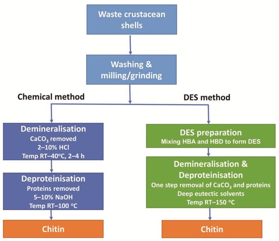 This review reveals that DES-mediated extraction of chitin from crustacean shells offers several advantages compared to the chemical method. The former can facilitate the extraction of higher yields of chitin from a variety of crustacean shells with higher purity (99.1% purity). Despite the latter advantages, associated extraction procedures require further consideration; differences in the properties of shells from different species will likely require species-specific DES to extract chitin. Furthermore, the temperatures employed (50–150 °C) in the most successful protocols require significant energy expenditure. The possibility of solvent recycling to maximise the environmentally friendly nature of DES-mediated extractions has not been fully explored. Although significant research has been conducted to investigate the effects of different DES formulations, many of these studies have focused on choline chloride and malonic acid. The exploration of alternative DES formulations may improve the potential of DES-mediated extractions.
