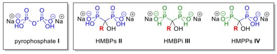 Structures of pyrophosphate I, HMBPs II and their HMBPi III and HMPP IV analogues.