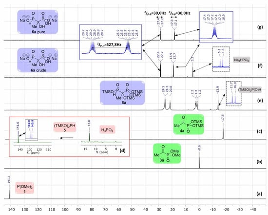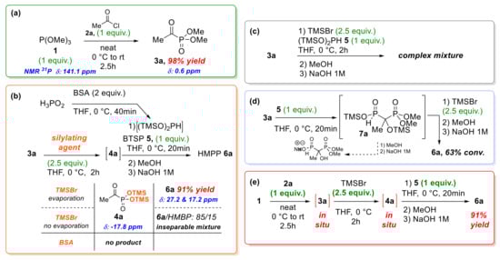 Figure 2 depicts the detailed 31P NMR monitoring of the total process that allowed us to propose the one-pot sequence. When acetyl chloride 2a was added to trimethylphosphite 1, its signal (141.1 ppm) disappeared in favor of an emerging new signal at −0.6 ppm corresponding to the dimethyl α-ketophosphonate 3a (Figure 2, spectra (b) versus (a)). During the following dealkylation step in the presence of TMSBr, the signal of 3a shifted in the negative chemical region (−17.8 ppm) which supported the formation of the silylated α-ketophosphonate 4a (Figure 2, spectra (c) versus (b)). Meanwhile, the preparation of BTSP 5 resulting from the silylation of hypophosphorous acid by BSA was simultaneously monitored by 31P and {1H}31P NMR spectroscopy as the signal of H3PO2 at 12.8 ppm faded away in favor of the appearance of a new peak at 141.6 ppm in the trivalent phosphorus region (Figure 2, spectra (d)). The doublet with a large coupling constant featured in the 31P spectrum corroborated the presence of the P-H bond. Thereafter, the monitoring of the subsequent addition of 5 onto 4a showed the fast disappearance of their signals and the formation of several peaks in the pentavalent phosphorus region (Figure 2, spectra (e) versus (c,d)). The two new sets of peaks at ~20 ppm and 1.5 ppm were assigned to 8a, which possesses two non-equivalent phosphorus atoms. The presence of a parasite peak was detected at −13.9 ppm (<7%) fitting to (TMSO)2P(O)H resulting from the oxidation of 5. After the final methanolysis and pH adjustment at 7, the two signal sets of 8a moved to 27.3 and 17.8 ppm as two thin doublets (2JP-P= 30.0 Hz) corresponding to the crude HMPP 6a (Figure 2, spectra (f) versus (e)). Regarding the different coupling constants in the 31P NMR spectrum, the two signals could be assigned, respectively, to the phosphinate moiety at 27.3 ppm (large 1J= 527.8 Hz, P–H) and the phosphonate group at 17.8 ppm. Finally, the easy purification of the crude HMPP 6a by precipitation enabled us to discard the disodium phosphonate by-product to furnish pure HMPP 6a (Figure 2, spectra (g) versus (f)).