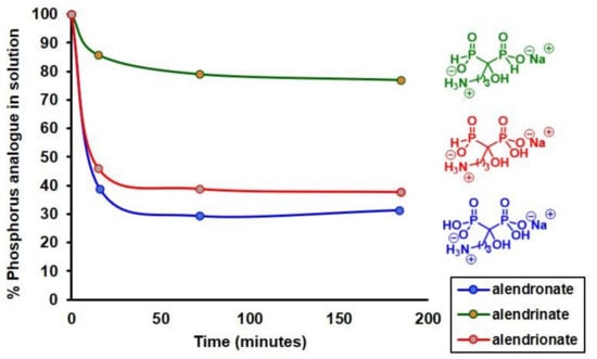 From 15 min, the HA complexation ratios were 61% and 54% for alendronate and alendrionate, respectively, versus only 14% for alendrinate. Complexing ratios then quickly reached a plateau around 50–70 min at 71%, 61% and 23% for HMBP, HMPP and HMBPi analogues, respectively. The alendronate results were in accordance with published data on esterified HMBP affinity for HA [32]. As expected, we verified that HMPP and HMBPi had slower fixation and lower affinity for synthetic calcium phosphate compared to HMBP. It was also interesting to point out that HA complexation rate of alendrionate 14o after 70 min was the same for alendronate after only 15 min.