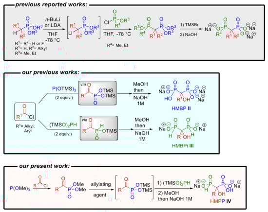 From a strategic point of view, the reaction between an acyl chloride and TTSP could theoretically be considered to firstly furnish a silylated α-ketophosphonate intermediate which could subsequently react with BTSP to yield the corresponding HMPP IV after methanolysis (Scheme 1). However, the direct addition of only one equivalent of TTSP onto an acyl chloride cannot lead properly to the sole silylated α−ketophosphonate. Indeed, this intermediate is highly reactive and can react itself with TTSP to form the corresponding HMBP II. This overreaction can be limited, but unfortunately, it takes place even at a lower temperature [22]. In our case, this side-reaction will lead, in the end, to an inseparable mixture of HMBP II and HMPP IV. To prevent the HMBP formation, firstly, the reaction between less reactive trimethylphosphite and an acyl chloride can be considered to prepare the dimethyl ester α-ketophosphonate exclusively. This diester is rather stable and can be easily isolated and stored for several months. Then, the dealkylation can be achieved by using a silylating agent to generate the corresponding silylated α-ketophosphonate, which can undergo the attack of BTSP to finally provide the expected HMPP IV disodium salt after methanolysis and basic treatment. Herein, we report our methodological development to efficiently access various substituted HMPPs IV.