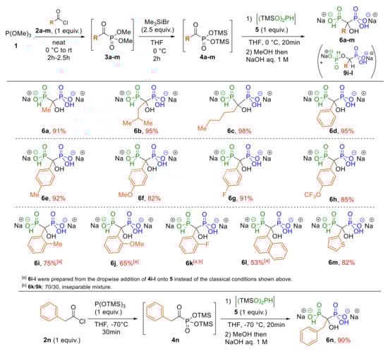 Thereafter, the dealkylation step was carried out in the presence of a required excess of silylating agent (Scheme 2: pathway (b)). We observed that bromotrimethylsilane (TMSBr) can effectively trigger the dealkylation of 3a to generate the silylated compound 4a exhibiting a shift in 31P NMR signal in negative values (−17.8 ppm) [23]. After evaporating the volatile fractions under reduced pressure, the silylated HMPP was rapidly formed by dropwise adding the silylated phosphonite 5 for 20 min at 0 °C. The reaction had already been completed since the end of the BTSP 5 addition. Then, a methanolysis step followed by a pH adjustment to 7 yielded 6a as disodium salt in an excellent yield of 91% after easy purification by precipitation. For the latter step, the preparation of bis(trimethylsilyl)phosphonite 5 can be smoothly achieved by the silylation of hypophosphorous acid in the presence of N,O-bis(trimethylsilyl)acetamide (BSA) as previously reported [12,13,14,21,24].