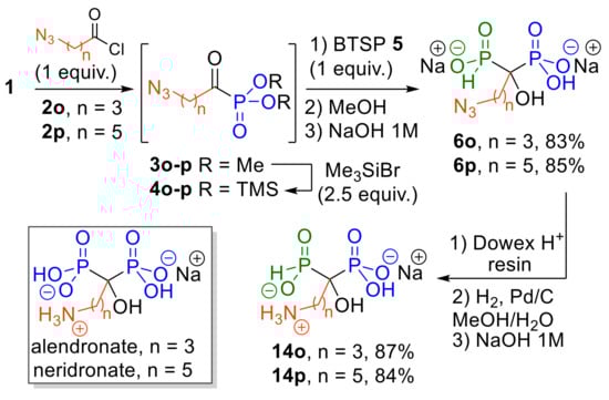 First of all, 4-azidobutanoyl and 6-azidohexanoyl chlorides 2o-p were synthesized starting from the corresponding 4-azidobutanoic and 6-azidohexanoic acids [12]. Then, 2o-p were mixed with trimethylphosphite 1 to produce the azidoalkyl-α-ketophosphonates 3o-p, respectively. The in situ dealkylation of 3o-p triggered by 2.5 equivalents of bromotrimethylsilane gave the corresponding silylated azidoalkyl-α-ketophosphonates 4o-p. The subsequent addition of BTSP 5 finally allowed the silylated azidoalkyl-HMPPs to be formed, which were treated by methanol to furnish the desired azidoalkyl-HMPPs 6o-p, respectively, in excellent yields of 83% and 85% after purification and pH adjustment (pH = 7). Afterwards, the HMPP disodium salts 6o-p were acidified by using a commercially available Dowex® H+ resin in order to avoid palladium complexation. The HMPP acidic derivatives then underwent a hydrogenolysis step in the presence of dihydrogen and palladium on charcoal. The end of reaction was monitored by 31P NMR spectroscopy eventually. The expected aminoalkyl-HMPPs 14o-p were finally isolated in very good yields (87–84%) after pH adjustment at 7.