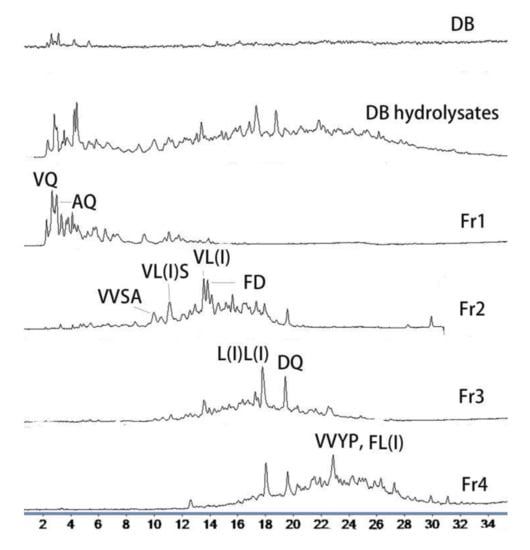 HPLC-MS chromatogram of deer blood (DB) hydrolysates and fractions.