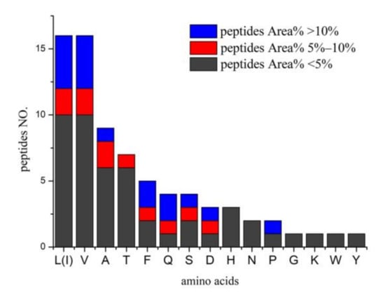 The MS spectra of Fr1, Fr2, and Fr4 are shown in Figure 1; these three fractions were comprised of different types of peptides. As identified by HPLC-MS/MS analysis, Fr1, Fr2, and Fr4 had 31 peptides (Table 2). VAN, VVSA, L(I)L(I)VT, PHPTT, EVAF and VL(I)DAF are new peptides. These peptides were formed by 16 amino acids (Figure 3), and 25 peptides contained branched-chain amino acids (BCAAs). It can be noted from Figure 3 that there were 16 leucine/isoleucine and valine-containing peptides, respectively; six of each group were above 5% in content. Of the eleven main peptides (Area% > 5%), eight contained BCAAs. This suggests that the DB hydrolysates derived from mixed enzymatic hydrolysis are mainly comprised of BCAA-containing peptides. Besides, nine peptides contained Ala and four contained Gln (Figure 3). BCAAs valine, isoleucine, and valine are known to have various anti-fatigue effects, and many studies have evaluated the effects of BCAAs [20].