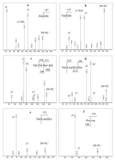 MS/MS spectra analysis of the main peptides Fr1and Fr2, (a) Ala-Gln, (b) Val-Gln, (c) Val-Val-Ser-Ala, (d) Val-Leu(Ile)-Ser, (e) Val-Leu(Ile), (f) Phe-Asp.