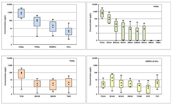 Water concentrations of DBPs in swimming pools (boxplots represent 10th and 90th percentiles, min and max values; circle and triangle represent mean and median values, respectively).