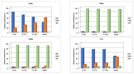 Ingestion, dermal contact and inhalation are the main exposure pathways to DBPs. The exposure to DBPs depends on the physical activity of swimmers and level of their effort, average time of swimming, body surface area, inhalation rate and rate of inadvertent ingestion of pool water [15,44]. The relative contribution of exposure routes to DBPs for different age-groups is shown in Figure 3.
