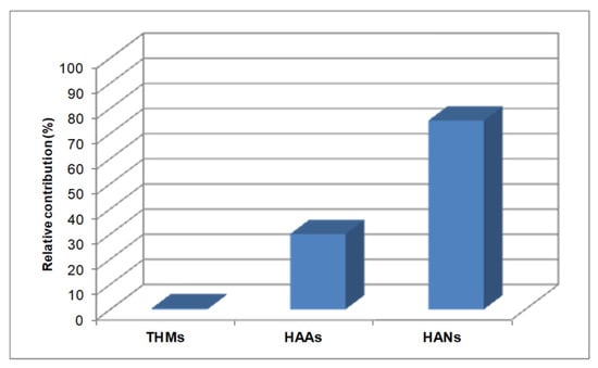The assessment of cytotoxicity of pool water was based on the measured DBP concentrations in water and their effective concentration (EC50) values [13]. The relative contribution of specific DBPs groups to the total calculated cytotoxicity of pool waters is shown in Figure 4.