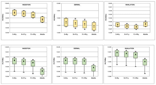 Route specific exposures varied among DBPs groups. Inhalation was the dominant exposure route for THMs (93–95%) and TCNM (88–92%). These compounds are highly volatile and occur in the air of natatorium. The presence of DBPs in air depends on their volatility, water concentrations, temperature of water, height above surface of swimming pool, water turbulence, humidity and air ventilation rates [16,34,45]. Inhalation was also found to be the main route of exposure to 1,1,1-TCP for children (75–80%), whereas adults exposed almost equally through ingestion and dermal absorption. Ingestion and dermal absorption were the main exposure routes for HAAs, 40–82% and 18–59%, respectively. Their relative contributing is age dependant; ingestion was the dominant exposure pathway for children, with a decreasing trend toward adults where dermal absorption became the main exposure pathway. This is because the inadvertent water intake varies with the age of swimmers, their skill and experience and type of activity.