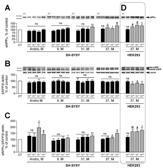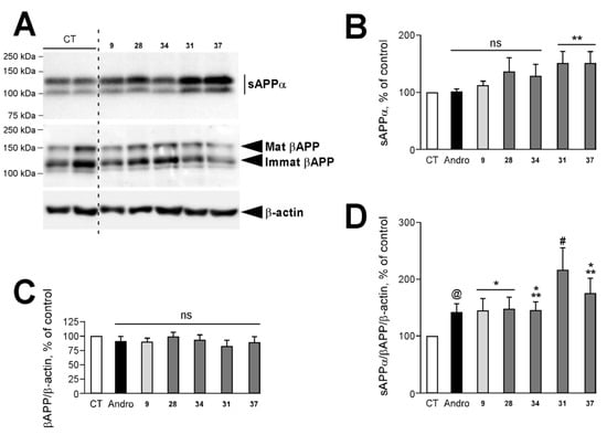 2.4.2. Dose-Dependent Effect of Derivatives 9, 31, and 37 on sAPPα Production, βAPP Protein Levels, and sAPPα/βAPP Ratio