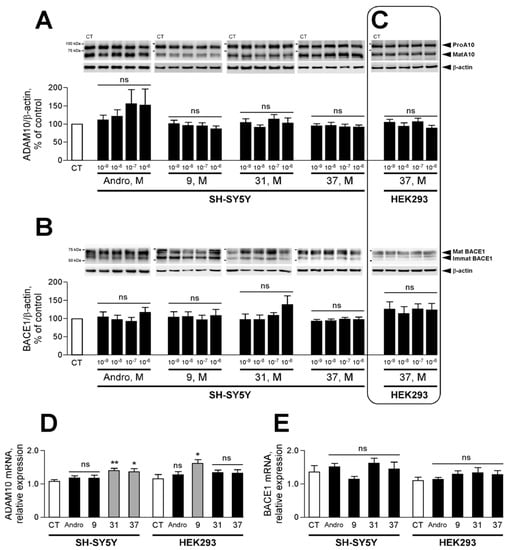 2.4.3. Effect of Derivatives 9, 31, and 37 on ADAM10 and BACE1 Protein and mRNA Levels