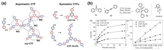 - Huang, W.; Byun, J.; Rörich, I.; Ramanan, C.; Blom, P.W.M.; Lu, H.; Wang, D.; Caire da Silva, L.; Li, R.; Wang, L.; et al. Asymmetric Covalent Triazine Framework for Enhanced Visible-Light Photoredox Catalysis via Energy Transfer Cascade. Angew. Chem. Int. Ed. 2018, 57, 8316–8320. [Google Scholar] [CrossRef]