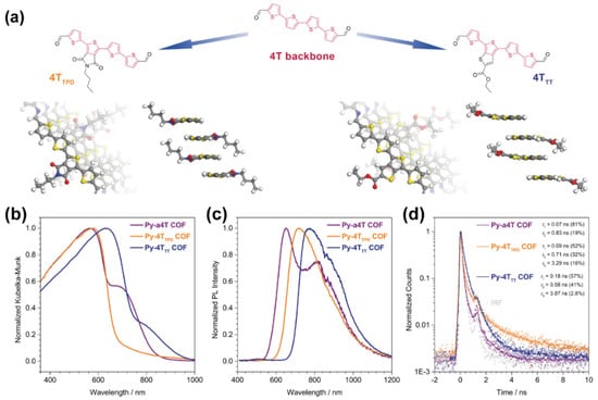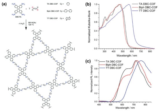 - Keller, N.; Sick, T.; Bach, N.N.; Koszalkowski, A.; Rotter, J.M.; Medina, D.D.; Bein, T. Dibenzochrysene enables tightly controlled docking and stabilizes photoexcited states in dual-pore covalent organic frameworks. Nanoscale 2019, 11, 23338–23345. [Google Scholar] [CrossRef]