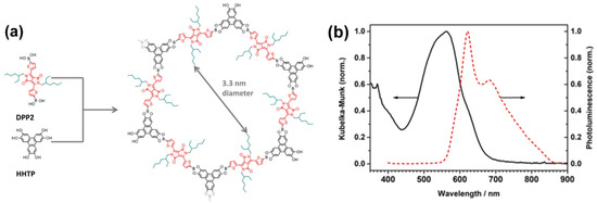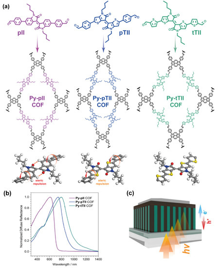 - Rager, S.; Jakowetz, A.C.; Gole, B.; Beuerle, F.; Medina, D.D.; Bein, T. Scaffold-Induced Diketopyrrolopyrrole Molecular Stacks in a Covalent Organic Framework. Chem. Mater. 2019, 31, 2707–2712. [Google Scholar] [CrossRef]