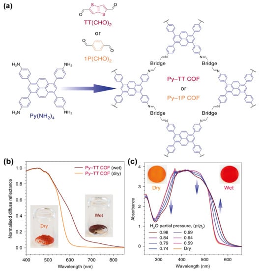- Ascherl, L.; Evans, E.W.; Hennemann, M.; Di Nuzzo, D.; Hufnagel, A.G.; Beetz, M.; Friend, R.H.; Clark, T.; Bein, T.; Auras, F. Solvatochromic covalent organic frameworks. Nat. Commun. 2018, 9, 3802. [Google Scholar] [CrossRef] [PubMed] [Green Version]