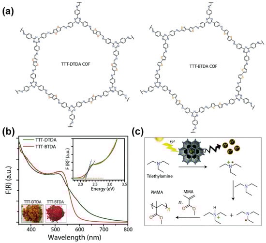 - Pachfule, P.; Acharjya, A.; Roeser, J.; Sivasankaran, R.P.; Ye, M.-Y.; Brückner, A.; Schmidt, J.; Thomas, A. Donor–acceptor covalent organic frameworks for visible light induced free radical polymerization. Chem. Sci. 2019, 10, 8316–8322. [Google Scholar] [CrossRef] [PubMed] [Green Version]