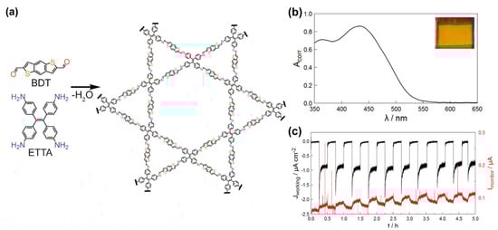 - Dogru, M.; Handloser, M.; Auras, F.; Kunz, T.; Medina, D.; Hartschuh, A.; Knochel, P.; Bein, T. A Photoconductive Thienothiophene-Based Covalent Organic Framework Showing Charge Transfer Towards Included Fullerene. Angew. Chem. Int. Ed. 2013, 52, 2920–2924. [Google Scholar] [CrossRef]