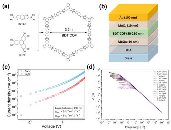 - Medina, D.D.; Petrus, M.L.; Jumabekov, A.N.; Margraf, J.T.; Weinberger, S.; Rotter, J.M.; Clark, T.; Bein, T. Directional Charge-Carrier Transport in Oriented Benzodithiophene Covalent Organic Framework Thin Films. ACS Nano 2017, 11, 2706–2713. [Google Scholar] [CrossRef]