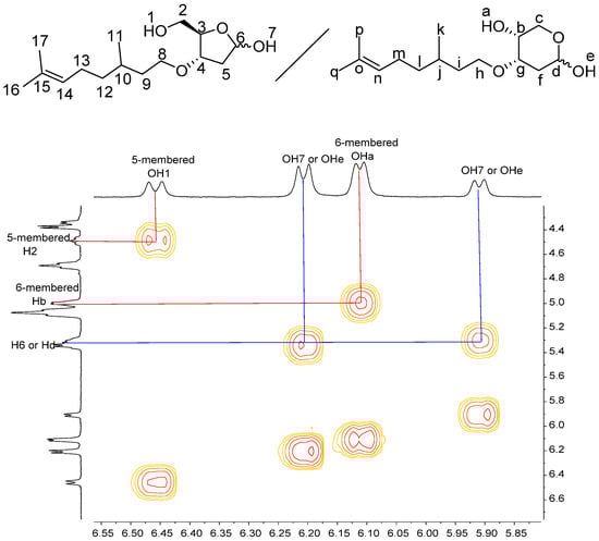 Although we were able to avoid the formation of Triol-citro, NMR analyses showed in all cases, the presence of a mixture of 5- and 6-membered cyclic forms of Lactol-citro (Scheme 3). Furthermore, as expected, 2 diastereomers of each cyclic structure are present (See SI, Figures S11–S15, for more details). Indeed, the ring-chain tautomerism of furanoses (5-membered rings) and pyranoses (6-membered rings) is very common in sugars [35]. These furanose-pyranose interconversions exist in equilibrium which led in our case to a mixture of Lactol-citro molecules as depicted in Scheme 3. Although the isolation of one pure product was not possible, 1H NMR analysis showed a major occurrence (64%) of the more stable 6-membered derivative. Indeed, the presence, as well as the (inter-)conversions, of both rings can be monitored thanks to the proton resonances of the 4 OH signals at 6.46, 6.21, 6.11 and 5.91 ppm. More precisely, as shown in Figure 2, careful examination of the 1H-1H COSY spectrum led to the attribution of the peaks at 6.26 and 6.11 ppm to the OH groups of the 5- and 6-membered lactol rings, respectively.