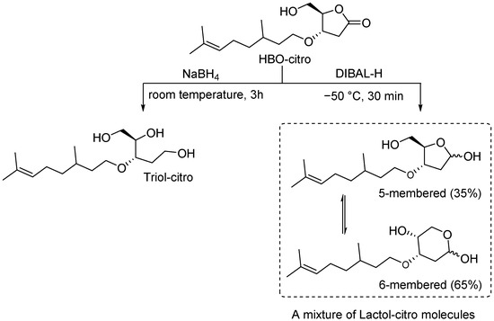 In an attempt to perform the selective reduction of HBO-citro to synthesize a diol derivative, an alternative route involving diisobutylaluminum hydride (DIBAL-H) as a reducing agent was adopted. More precisely, a 1 M solution of DIBAL-H was added dropwise to a solution of HBO-citro at −50 °C in anhydrous DCM. The reaction mixture was then left to stir at −50 °C for 30 min to afford a colorless oil in 89% yield. The reaction was carried out under a nitrogen atmosphere and strictly anhydrous conditions for a short duration (30 min) to avoid the formation of Triol-citro. The latter was formed in the presence of water traces and for a reaction time exceeding 30 min. Furthermore, if the reaction was performed under air, the reaction yield was dropped to 44%. The performance of 2-MeTHF as a replacement of DCM, a highly toxic molecule, was highlighted (44% yield after a reaction duration of 30 min).