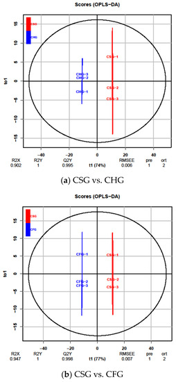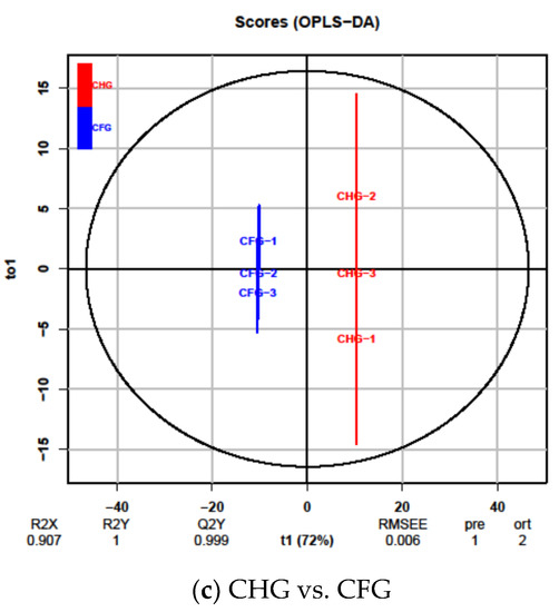Differential flavonoid metabolite analysis on the basis of orthogonal signal correction and partial least squares discriminant analysis (OPLS-DA); (a–c) OPLS-DA model plots for comparison of CSG vs. CHG, CSG vs. CFG and CHG vs. CFG.
