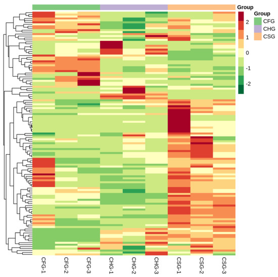 In order to facilitate the identification of the change-rule of the metabolites, those with significant differences were normalized by processing and a clustering heatmap was drawn (Figure 4). Figure 4 presents a simple and intuitive depiction of the changes in the metabolites. CSG featured 123 different flavonoid metabolites, CHG 120, and CFG 114, the specific results are shown in Table S1. The content of most of the metabolites in T. chinensis from CSG was u-regulated, which was significantly different from what was observed in CHG and CFG.