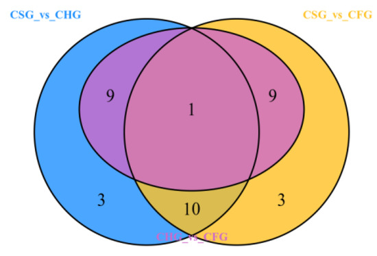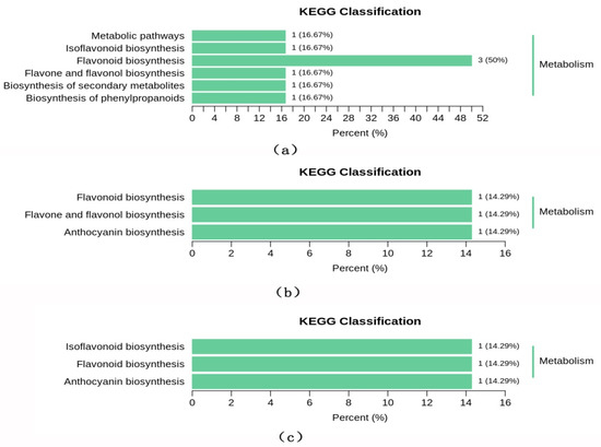 The Venn diagram displays the number of overlapping and unique differential metabolites for each of the group comparisons: CSG vs. CHG, CSG vs. CFG and CHG vs. CFG (Figure 6). The results demonstrate that CSG vs. CHG and CSG vs. CFG intersected 11 different metabolic compounds, indicating that these 11 components were characteristic of CSG where the relative content of 10 metabolites was upregulated (Table 1). There was only one component in the intersection of all the groups, indicating that there were large differences in the differential metabolites of each sample. The KEGG classification results and enrichment analysis (Figure 7a–c) indicate that the differential flavonoid metabolites of the comparison groups were involved in the biosynthesis of flavonoids, flavones, flavonols, anthocyanins and isoflavonoids.