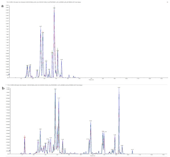 Mass spectrometry quality control (QC) total ion current (TIC) superposition diagram. (a) Diagram of TIC of negative-ion multiple reaction monitoring (MRM). (b) TIC of positive-ion MRM diagram.