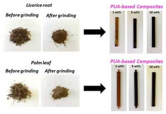 In this work, two types of biomasses, one from the first type, a by-product of the food industry, namely licorice root, and one of the second group, obtained from differentiated waste collection of garden waste, namely Canary date palm (Phoenix canariensis) leaf, have been compared as for their introduction in a poly(urethane-acrylate) (PUA) matrix. On the former, a previous study aimed at its introduction in epoxy offered some promising results [15]. However, PUA proved very suitable in general for its possible combination with lignocellulosic waste [16]. However, the attention towards diversifying the filler in this polymer has been limited so far. The availability of large amounts of differentiated biomass from a large number of species could open further opportunities for PUA in the fabrication of biocomposites. The novelty of the work is in the application of these two lignocellulosic waste fillers, as an example for other available fillers, into a poly(urethane-acrylate) (PUA) matrix, with the intent to characterize the capability of this polymer instead of the classical epoxy resins. PUA has been used in view of its capacity to offer effective coatings for lignocellulosic substrates for the possible quality of its interaction with these: this has been verified e.g., in the case of bamboo [17].