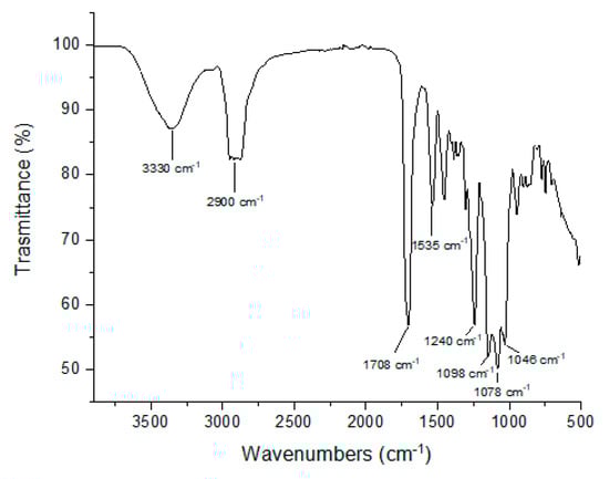 The characteristic absorption peaks at 3330 cm−1 and 1535 cm−1 were attributed to the stretching vibration absorption of N–H in the urethane group, and the absorption bands in the range of 2800–2930 cm−1 were related to the stretching vibration of C–H. The peaks at 1708 cm−1 and 1240 cm−1 were related to C=O and C–N stretching vibration, respectively. The absorption bands in the range of 1046–1098 cm−1 were attributed to C–O stretching vibration.