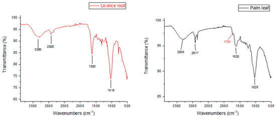 Licorice root and palm leaf wastes were characterized by FTIR-ATR, TGA and SEM analysis. The FTIR spectra show a very strong peak around 3300 cm−1, related to the –OH stretching, as well as the aliphatic –CH and –CH2 stretching at 2856–2925 cm−1. The peaks at around 1620 cm−1 and 781 cm-1 are assigned to aromatic skeletal vibration allied to the out-of-plane stretching and bending of aromatic –CH, respectively. In contrast, those in the region from 1031 to 1160 cm−1 are assigned to the –C–O stretching vibration, and the peak at 1427 cm−1 is assigned to the –CH, –CH2 bending of aliphatic carbons [15]. Palm leaf shows also the –C=O stretching vibration at around 1731 cm−1 (Figure 3). This peak is related to ester bond of carboxyl group of ferulic and p-coumaric of lignin or acetyl ester groups and uronic groups of hemicelluloses [21].