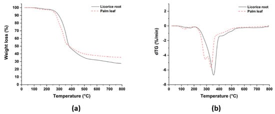 Thermal degradation behavior of palm leaf and licorice root wastes: (a) weight loss vs. temperature and (b) derivative of weight loss (percent/minute) vs. temperature.