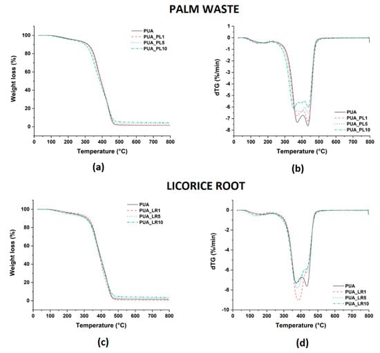 As shown in Figure 6, the global decomposition path is not significantly affected by the presence of the fillers, albeit a modest reduction in the temperatures of 10% weight loss and maximum degradation can be observed (Table 4), quite limited in the case of palm leaf filler. In the case of licorice root waste, the fluctuating results can be ascribed to issues related to its dispersion and agglomeration, especially at increasing weight fractions, which could have changed the decomposition diffusion pathway of PUA, affecting the thermal stability.