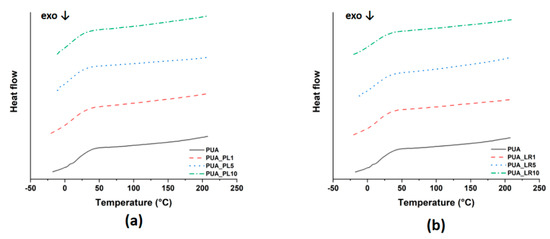 From TGA results, the presence of fillers did not affect in a significant way the thermal stability of the matrix, and this was confirmed also by DSC analysis. Figure 7 shows the DSC thermograms for neat PUA and all the composite formulations.