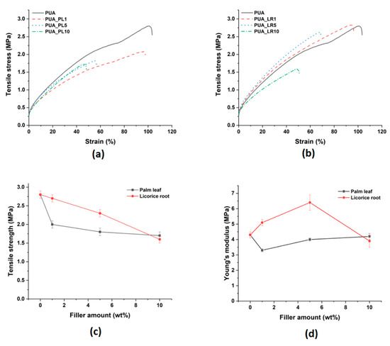 Tensile response of PUA and related composite formulations: (a) typical tensile stress vs. strain curves for PUA-palm leaf composites; (b) typical tensile stress vs. strain curves for PUA-licorice root composites; (c) tensile strength as a function of filler amount; (d) Young’s modulus as a function of filler amount.
